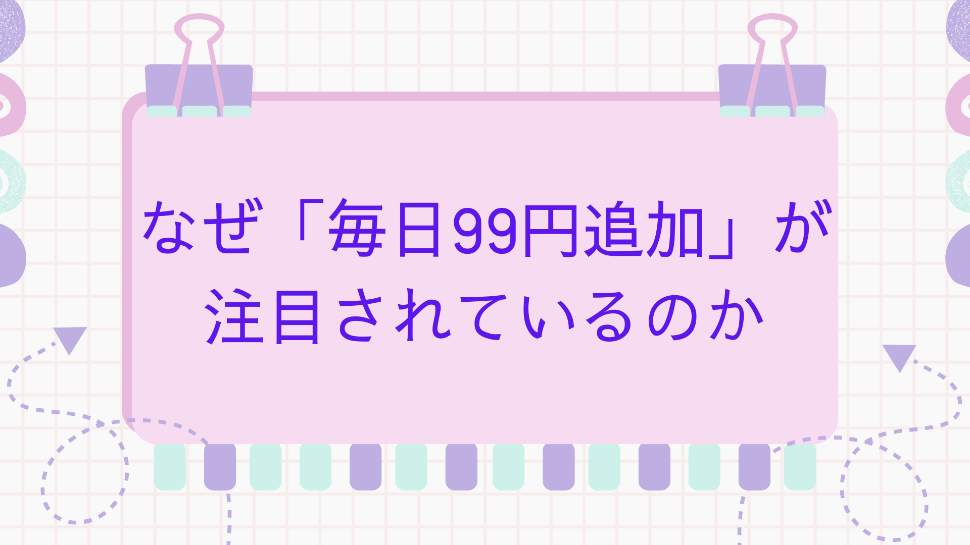 本記事では、実際に「毎日99円追加」を続けてきた筆者の体験をもとに、そのメリット・デメリット、そして継続するコツをわかりやすく解説します。